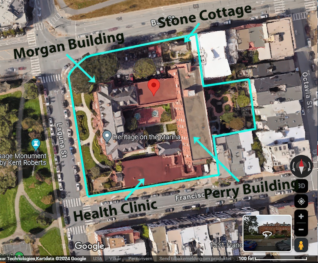 The Ladies’ Protection and Relief Society is a retirement home (known today as The Heritage) located in San Francisco’s Marina District. Designed by famed architect Julia Morgan in the Jacobethan style and built in 1925, the three-story brick residential building is bounded on three sides by well-tended grounds. The Ladies’ Protection and Relief Society is San Francisco’s second-oldest charitable organization and the first established by and for women. It was founded to care for homeless young women and their children, providing housing, childcare, and job placement. In the 1950s, the organization shifted its focus, transitioning into a high-end retirement home for both men and women.